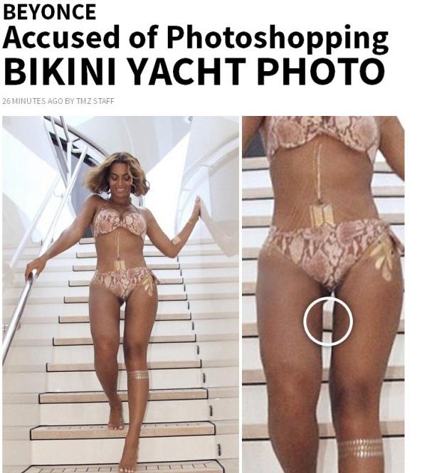 Comme le fait remarquer le site TMZ, le morceau marche visible entre les jambes de la femme de Jay-Z n’est pas aligné avec les extrémités, visibles à l’extérieur. Ce n’est pas la première fois que la chanteuse est suspectée d’avoir recours au célèbre pinceau numérique. Jugez plutôt :