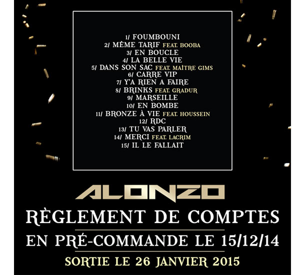Fin du suspense…Alonzo dévoile le tracklisting de son nouvel album Règlement de Comptes en pré-commande le 15 décembre 2014.