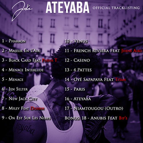 Parmi ces 18 titres dont le bonus « Venus », deux sont déjà connus du public : Miley en featuring avec Dosseh et Majeur en l’air produit par Therapy, le beatmaker le plus prisé du moment. Les invités d’Ateyaba sont au nombre de cinq : le rappeur américain Pusha-T, la chanteuse Jhene Aiko, Dosseh ainsi que ses acolytes Titan et Bip’s du collectif Les Monsieurs.