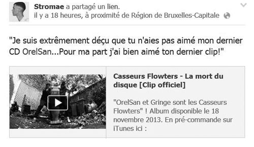 Plus tard, sur les réseaux sociaux, Stromae a réagi à ce morceau d’Orelsan et Gringe via sa page facebook aux 2,5 millions de fans. Pour le taquiner en faisant référence au titre, le Belge s’est dit « extrêmement déçu » qu’Orelsan n’ait pas aimer son dernier album Racine Carrée. Bien sûr le tout sur un ton taquin.
