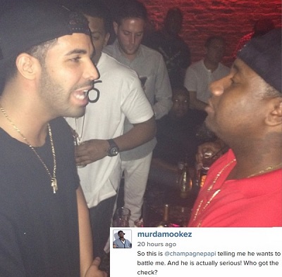 Drake est-il devenu fou ? Ou Murda Mook est-il un menteur ? Dans la photo que Mook a posté sur Instagram on voit le rappeur canadien apparemment en grande conversation avec lui. La légende de la photo est assez explicite « Alors c’est @champagnepapi en train de me dire qu’il veut faire une battle contre moi. Et il est vraiment sérieux. Qui va payer ? »