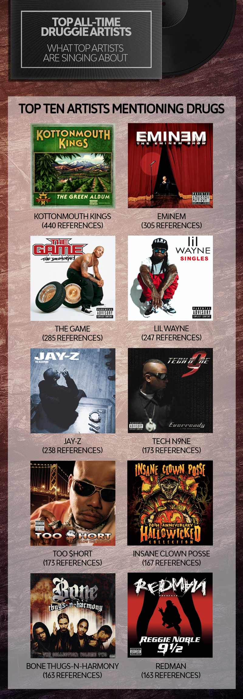 Idem pour la marijuana. Le groupe Kottonmouth Kings (344 références), The Game (125), Cypress Hill (124), Bones-Thugs-N-Harmony (113) et Redman (109) trustent allégrement les cinq premières positions.