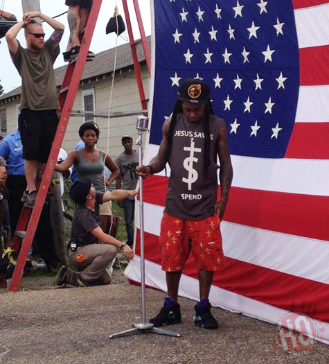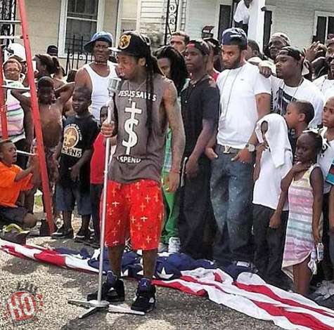 Il y a quelques jours Lil Wayne était chez lui dans son quartier de Holygrove à la Nouvelle-Orléans pour le tournage du clip de God Bless Amerika tiré de son album I Am Not A Human Being II. Selon plusieurs témoins dont TMZ, Weezy a été vu plusieurs fois en train de piétiner le drapeau américain. Dans un pays très patriotique comme les Etats-Unis (par exemple avant toutes les grandes manifestations sportives ou culturelles on chante l’hymne national) c’est considéré comme un « crime » !