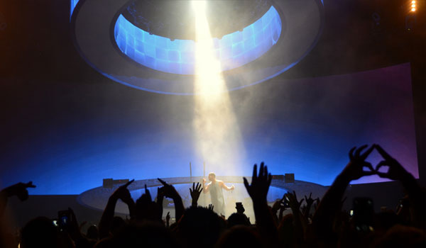 Cette simplicité contraste avec l’incroyable scène pensée par le designer Willo Perron qui a notamment travaillé avec Kanye West. Il y a d’abord deux cercles lumineux – symbole de son label OVO ? – un au sol où sont placés les musiciens, et un autre au plafond, incrustés de panneaux lumineux. Ensuite dans le fond un écran projette, la captation en direct de la prestation, les fans en folie et des images de flammes, de fumées et des archives de Drake. Enfin, et c’est le plus imressionnant il y a une immense passerelle circulaire brillante. Elle a permis à Drake au millieu du concert d’être au-dessus de la foule, de s’approcher, des fans dans la fosse comme de ceux des derniers rangs des gradins du gigantesque Palais Omnisport pour leur faire des dédicaces durant vingt minutes. Un garçon poli on vous dit.