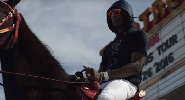 La diffusion de la photographie de Young Thug sur un cheval en pleine rue n’avait pas manqué de faire réagir internet. Nous annoncions à ce moment un bon moyen pour Thugger de faire la promotion de sa tournée américaine à venir, sans pouvoir être plus proche de la vérité. Il vient de dévoiler la fameuse vidéo dans laquelle on le retrouve perché sur son destrier afin d’annoncer les dates de son Hy!£UN35 Tour qui débutera le 1er mai 2016 à Philadelphie. Les billets seront mis en vente vendredi 25 mars 2016, dernière date annoncée pour la sortie de Slim Season 3 ! De quoi également imaginer une date de sortie avant le 1er mai pour son album Hy!£UN35 !