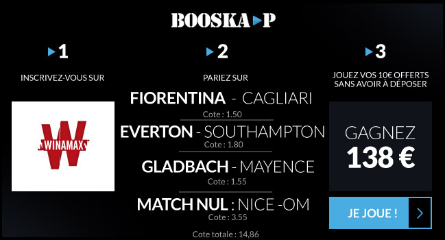 Comme seuls les gains nets de votre pari gratuit de 10€ offert vous seront crédités sur votre compte joueur, on vous propose un gros combiné sur les matchs de dimanche cote à 14,86.