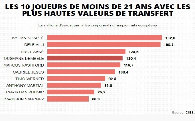 Et au milieu des autres Dele Alli (180,2 millions d’euros) et Leroy Sané (124,5 millions d’euros), les Français sont en bonne place. Le parisien Kylian Mbappé se classe ainsi comme le joueur de sa génération à la plus forte valeur marchande (182,8 millions d’euros) pendant qu’Ousmane Dembélé, bien que blessé au Barça, se poste en quatrième position de ce classement (120,4 millions d’euros). Anthony Martial, attaquant de Manchester United arrive lui à la 8ème place du top, fort d’une valeur estimée à 85,6 millions d’euros.
