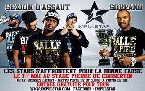 Le 1er mai, les parrains historiques que sont Rio Mavuba (Lille) et Soprano seront accompagnés de Souleymane Bamba (Leicester City) et Blaise Matuidi (PSG), ainsi que Lefa (Sexion d’Assaut). Le tournoi Impulstar est une compétition régionale de foot à cinq, destinée aux 14-16 ans. Des phases éliminatoires ont lieu pour chaque département. Le but est de permettre à certains jeunes de se faire remarquer, une sorte de tremplin vers une carrière de joueur professionnel.